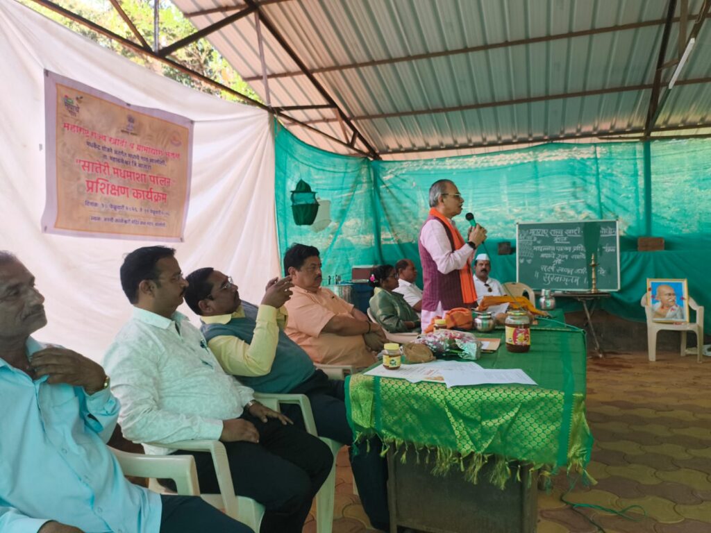 At the honey village of Saloshi, Mahabaleshwar, Satara, the Honorable Chairman visited the beekeepers’ training session and provided guidance.